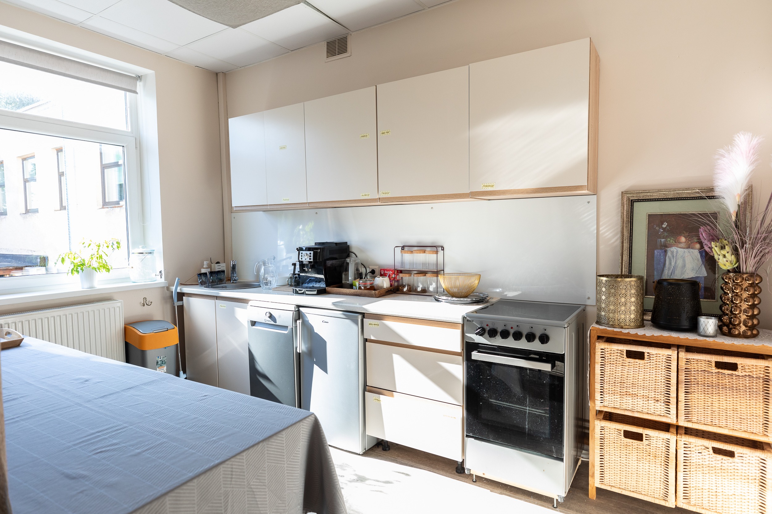 Ruumis on olemas eraldi kööginurk. Kööginurgas on olemas pisikene külmkapp, kiirkeedukann, erinevad teesegud, presskannud, pisemad kausid, taldrikud, klaasid, kruusid ja vajadusel võimalus kasutada kandikuid.